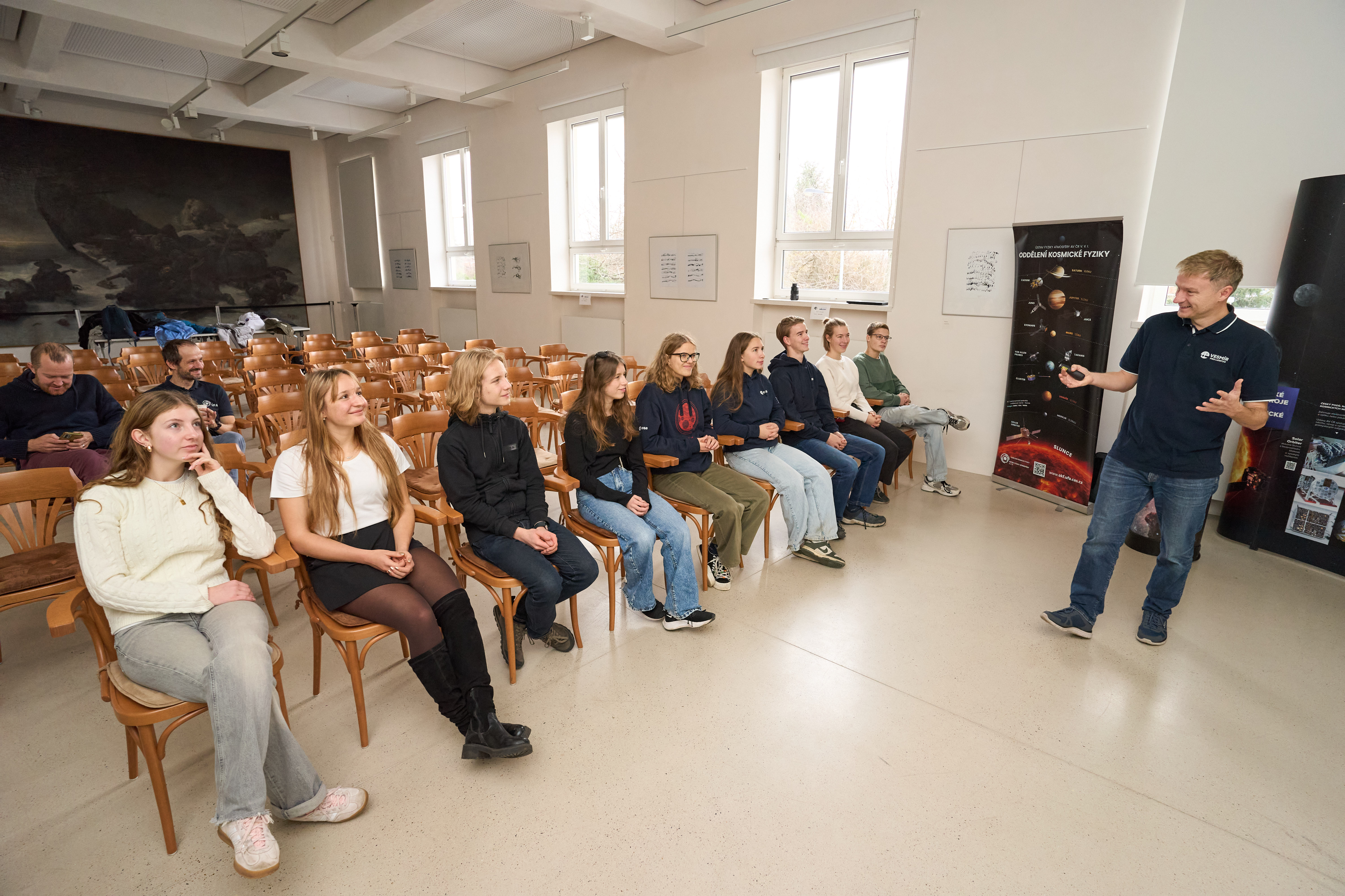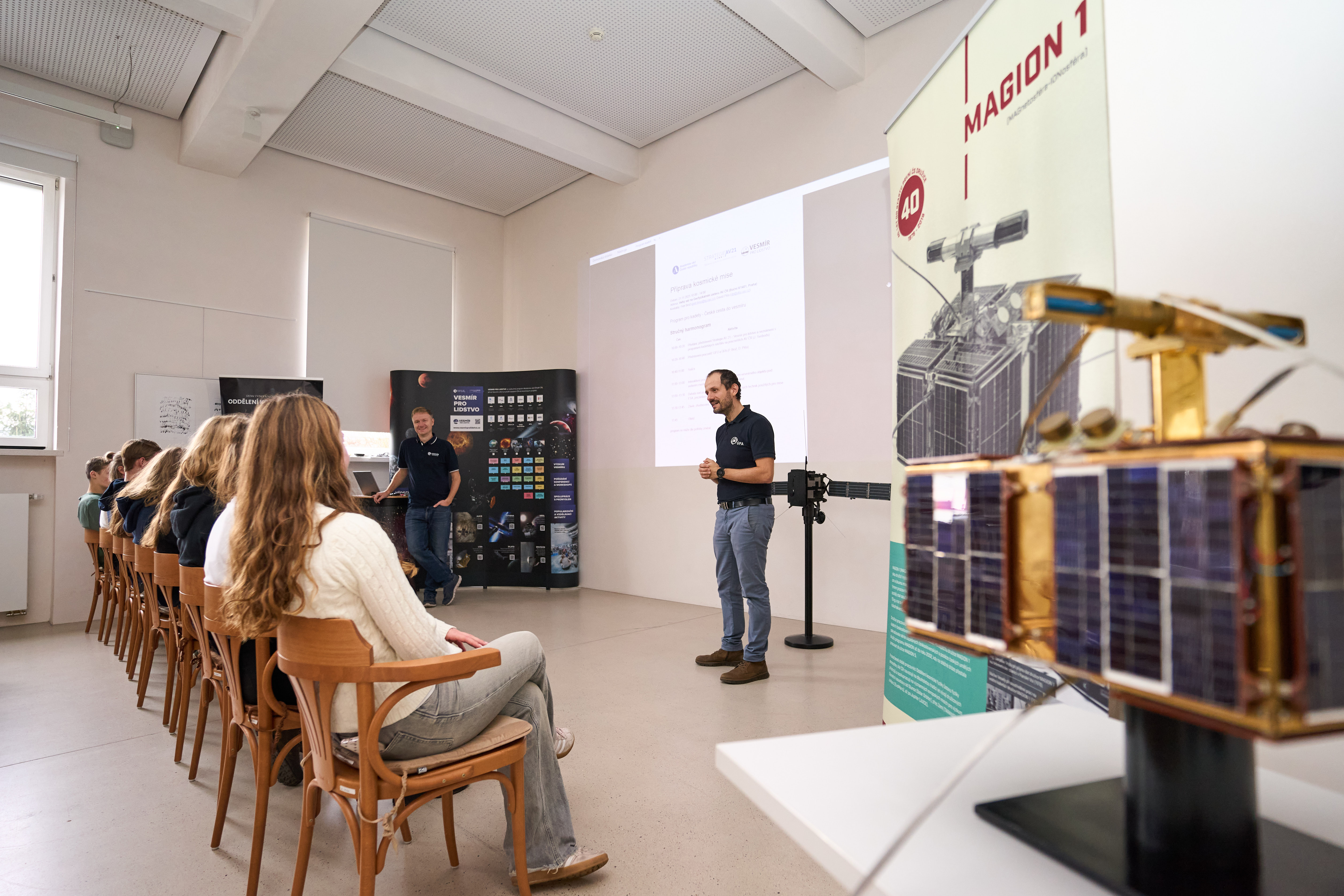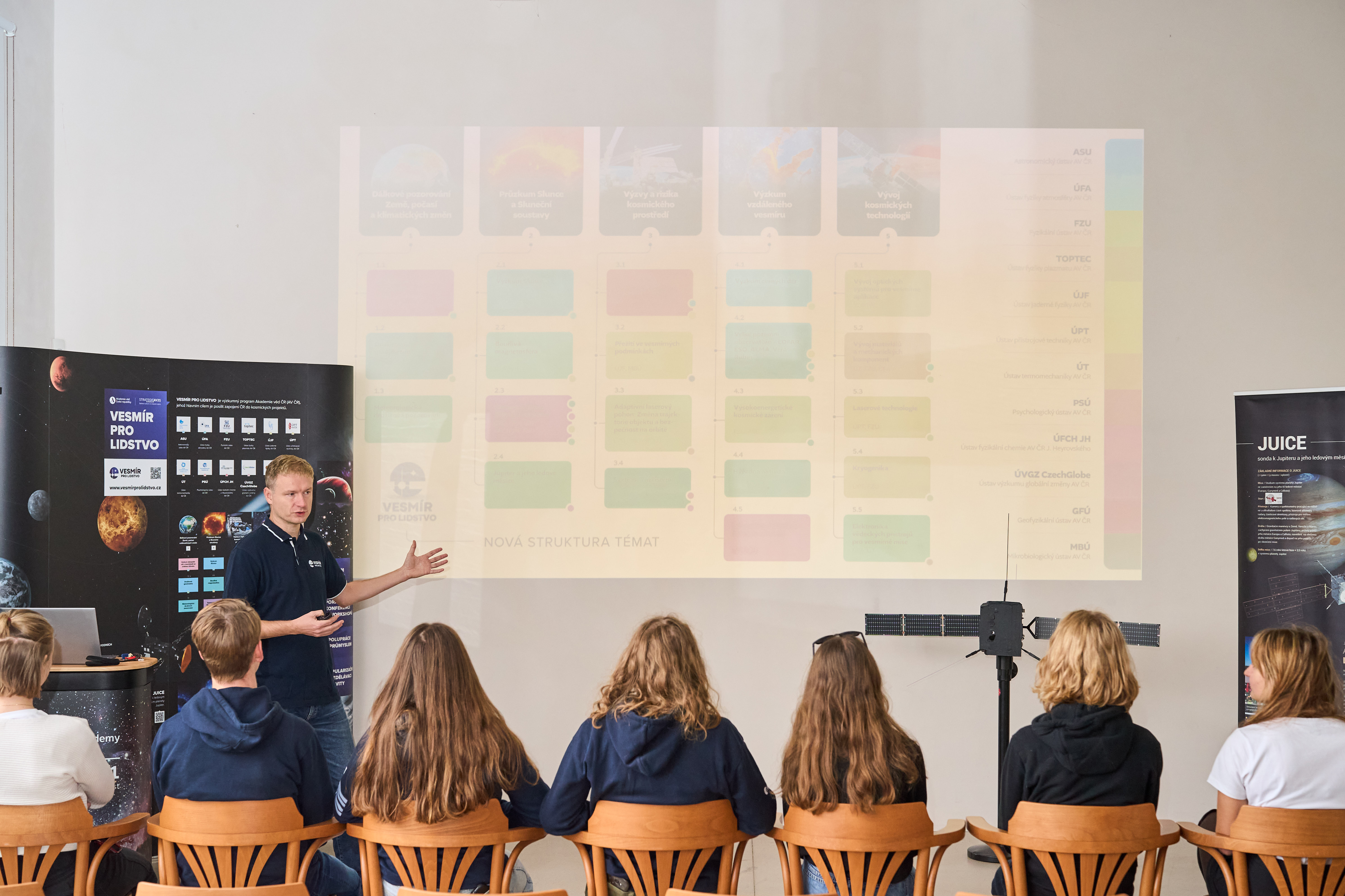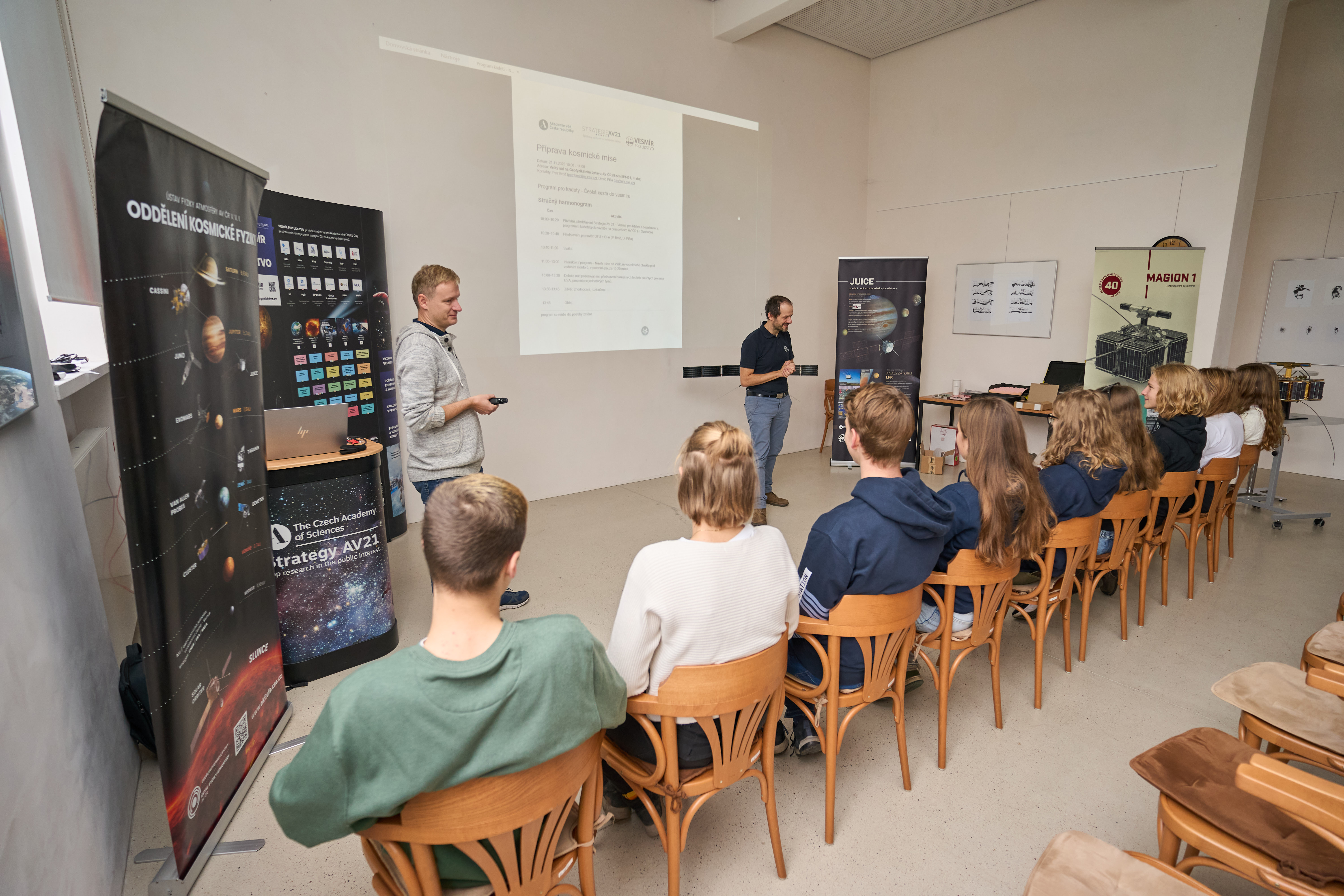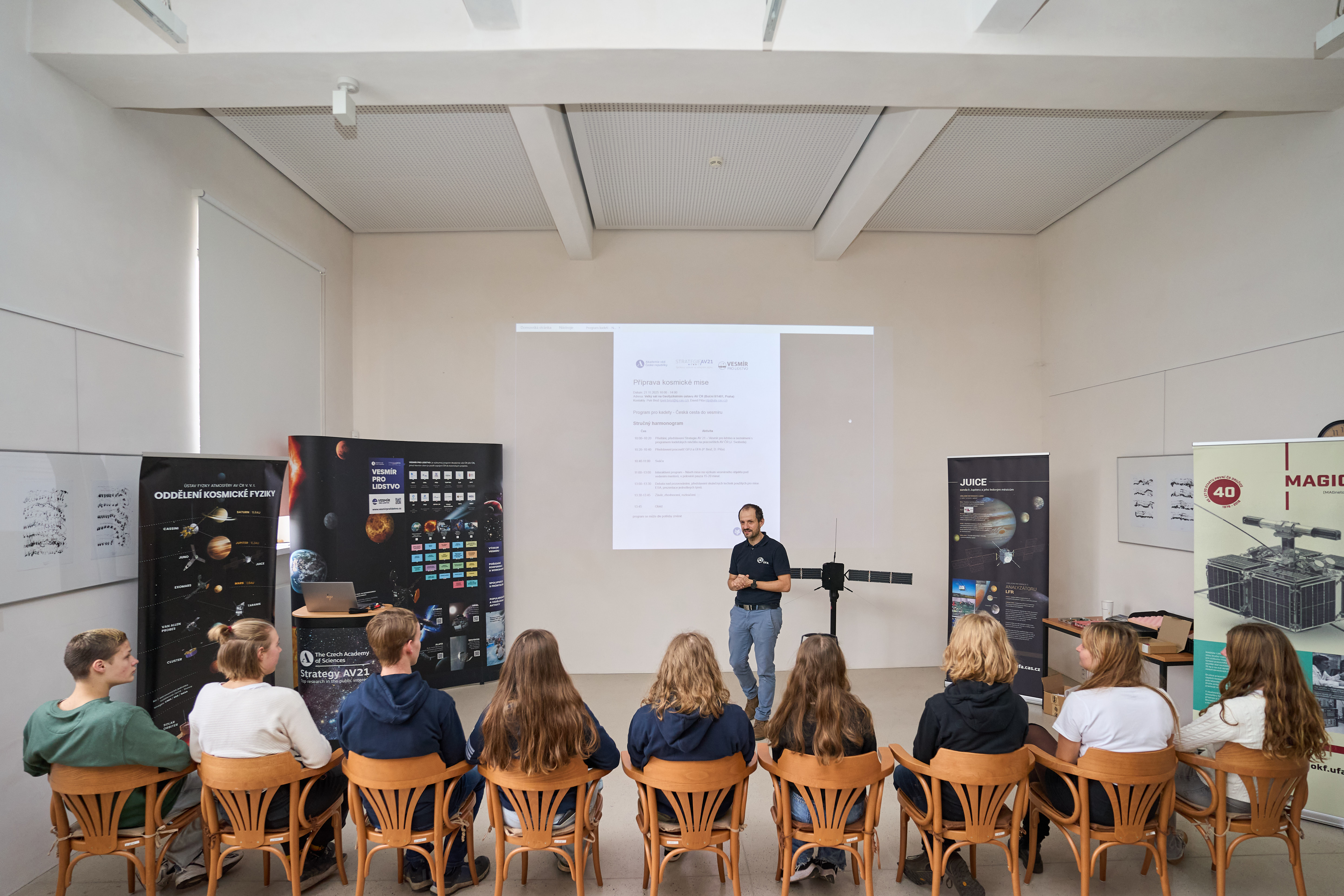 V rámci programu Vesmír pro lidstvo jsme 21. listopadu 2025 uspořádali tematický workshop pro kadety a kadetky projektu Zero-G, tedy mladé ambasadory a ambasadorky České cesty do vesmíru. Setkání mělo za cíl představit činnost vybraných pracovišť Akademie věd ČR zapojených do kosmického výzkumu a zároveň umožnit kadetům vyzkoušet si, jak vzniká skutečná kosmická mise – od prvotního nápadu až po kritické posouzení vědeckých a technických výzev.
